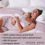 The Queen Anne 100% goose down pillow* is hand filled with 100% ethically sourced goose down from Europe. That means no feathers, just amazing down from the breast. The down is washed and cleaned to be allergy free.